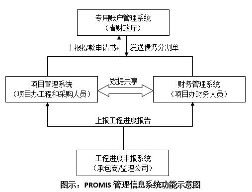 PROMIS管理信息系統(tǒng)主要由四個(gè)子系統(tǒng)組成,分別是由承包商和監(jiān)理公司使用的工程進(jìn)度申報(bào)系統(tǒng)、由各級項(xiàng)目辦工程和采購管理人員使用的項(xiàng)目管理系統(tǒng)、由各級項(xiàng)目辦財(cái)務(wù)管理人員使用的財(cái)務(wù)管理系統(tǒng)和由財(cái)政部門使用的專用賬戶管理系統(tǒng)。